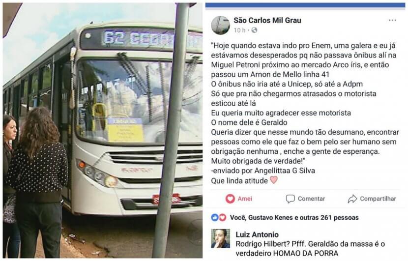 Em pleno domingo, após muito tempo de espera, o desespero já tomava conta de um grupo de estudantes em um ponto de ônibus da cidade de São Carlos (SP) que tentavam chegar ao local da prova do exame do Enem realizado no último domingo (5). Eis que aparece o super herói do dia, o motorista de ônibus chamado Geraldo Casali de 53 anos, que no ponto ao ver o desespero dos estudantes, mesmo sabendo que sua linha não faria rota até o local da realização da prova, o profissional decidiu mudar estendendo a rota indo até o local para garantir que os alunos conseguissem realizar o exame, no prédio da UNICEP (Centro Universitário Paulista).