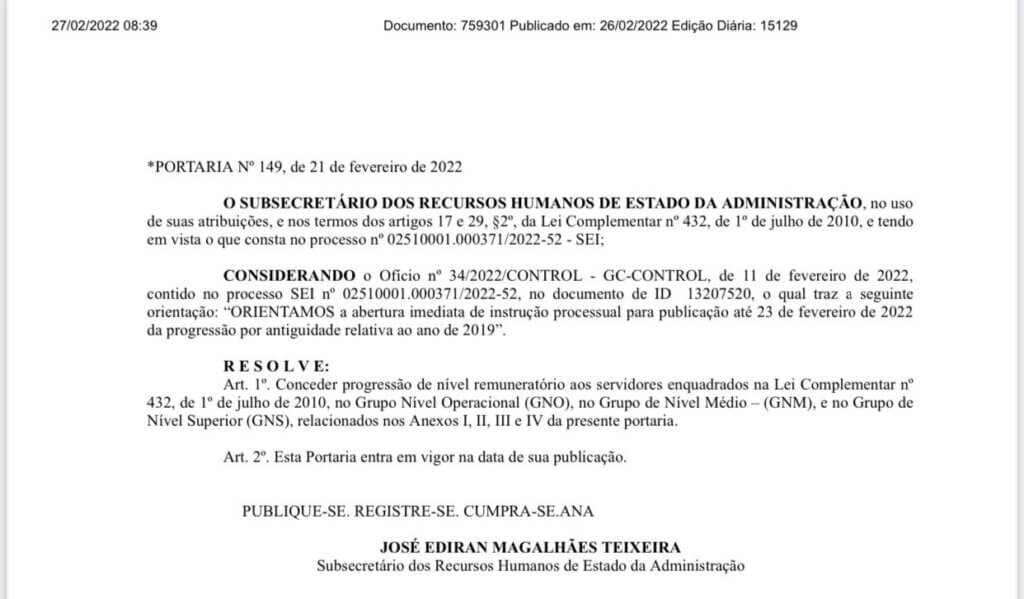 A publicação, que pode ser vista abaixo, sairá já no contracheque de março, retroagindo a data de 1° de janeiro de 2022.