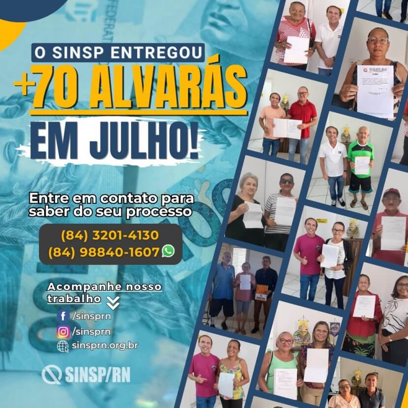 Dentre tantos alvarás conquistados pela assessoria jurídica do SINSP e depositados diretamente na conta do servidor, também estão dezenas entregues nas sedes do SINSP em Natal, Mossoró e Caicó. E foi justamente na cidade do Seridó que o SINSP entregou mais três alvarás no finalzinho de julho, para duas servidores e um servidor que vivem em São João do Sabugi.