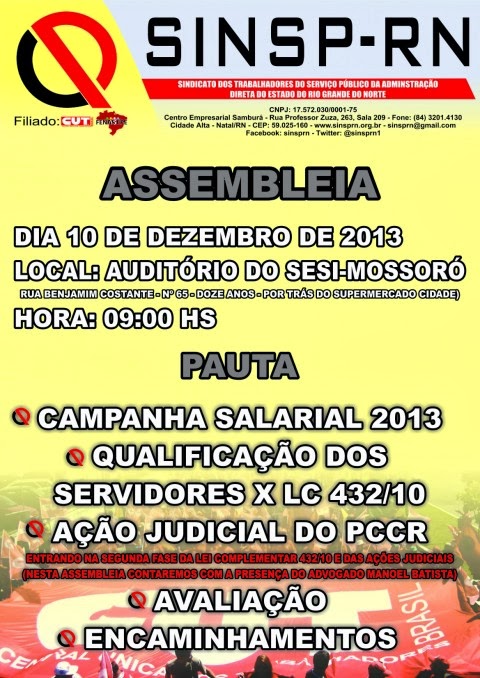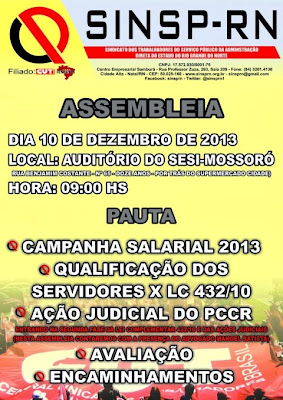 SINSP realiza assembleia em Mossoró, 10 de dezembro, às 9 horas, Auditório do SESI   Por     Em 08/12/2013 ás 13:45   -     Atualizado em   08/12/2013 ás 13:45   -     2334